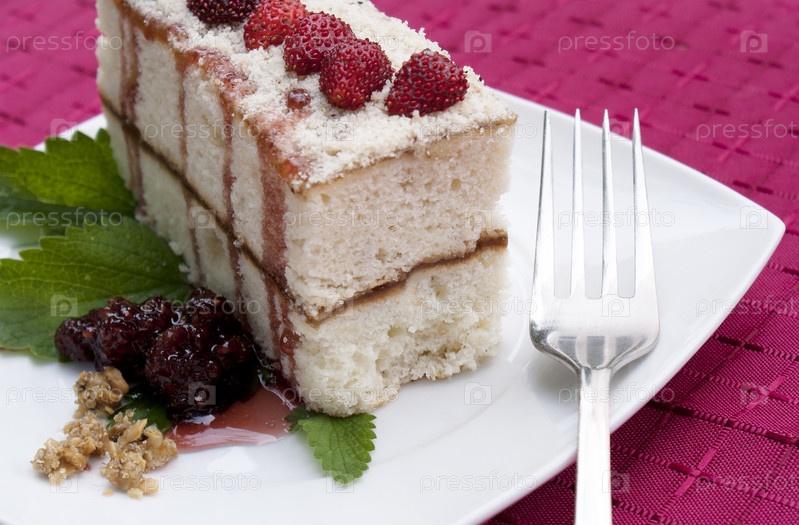 Сладкое аппетитное бисквитное пирожное с ягодами свежей земляники и малиновым джемом