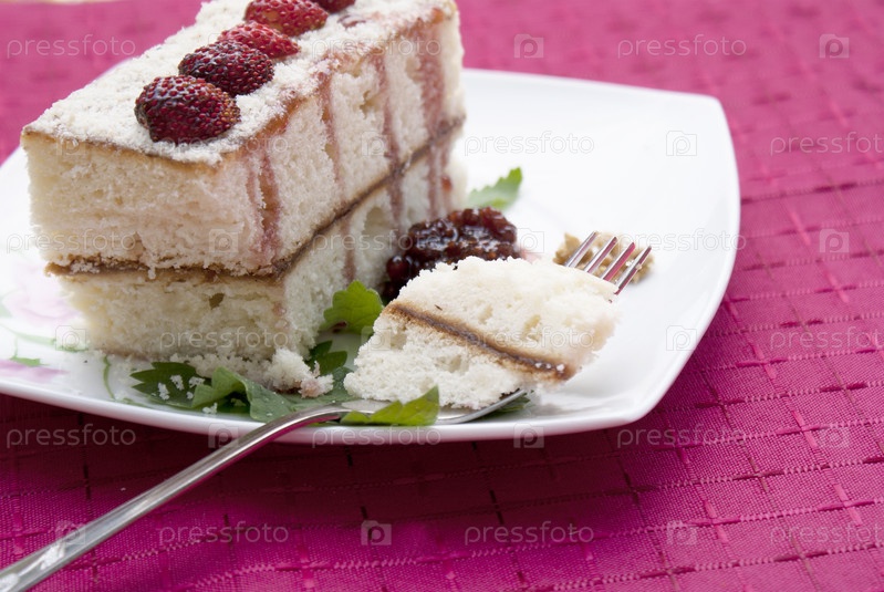 Пирожное с ягодами земляники и фруктовым малиновым джемом