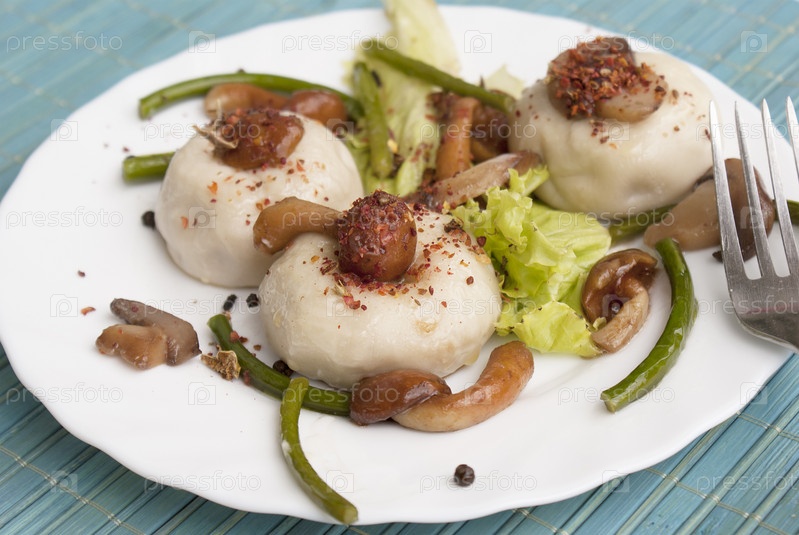 Аппетитные пельмени с жареными грибами и стеблями чеснока в пряных специях