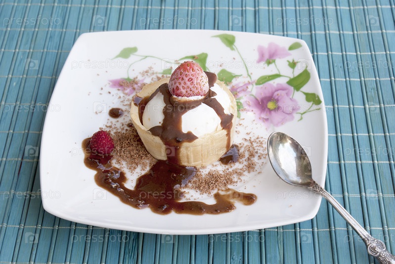 Мороженое пломбир со свежей клубникой и шоколадной глазурью