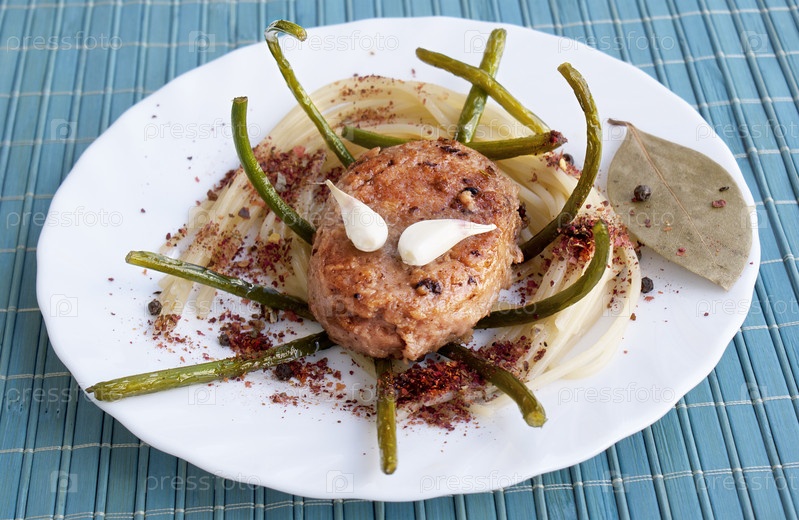 Аппетитная отбивная мясная котлета со спагетти и жареным чесноком в пряных специях