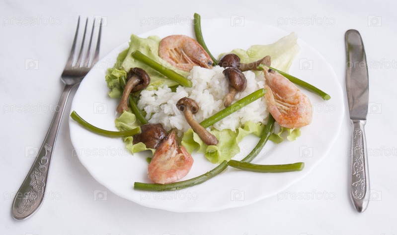 Аппетитные жареные грибы с рисом, отварными креветками, зеленым салатом и жареными стеблями чеснока