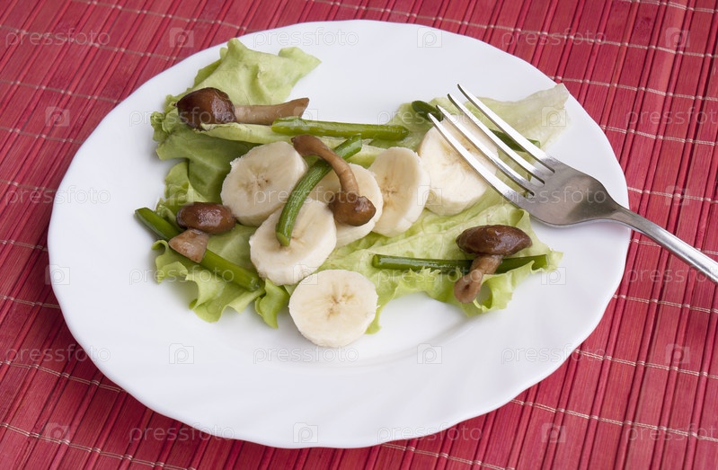 Креативный салат из жареных грибов, стеблей чеснока и сладких бананов