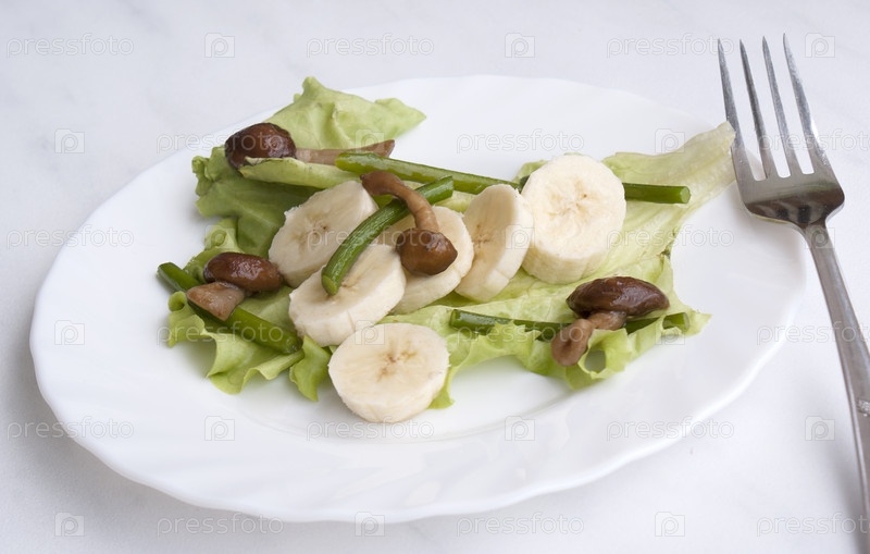Креативный салат из жареных грибов, стеблей чеснока и сладких бананов