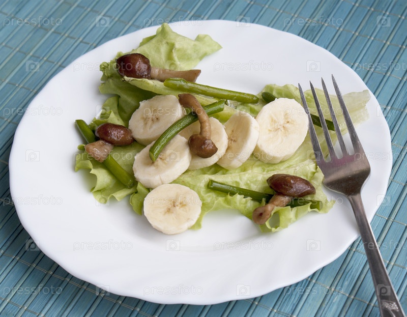 Креативный салат из жареных грибов, стеблей чеснока и сладких бананов