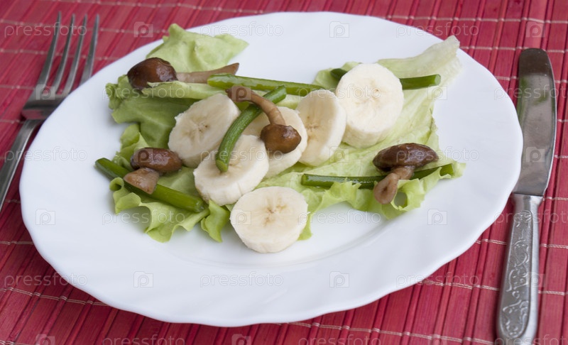 Креативный салат из жареных грибов, стеблей чеснока и сладких бананов