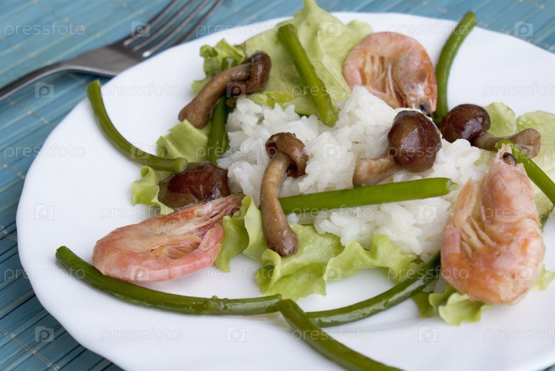 Аппетитные жареные грибы с рисом, отварными креветками, зеленым салатом и жареными стеблями чеснока