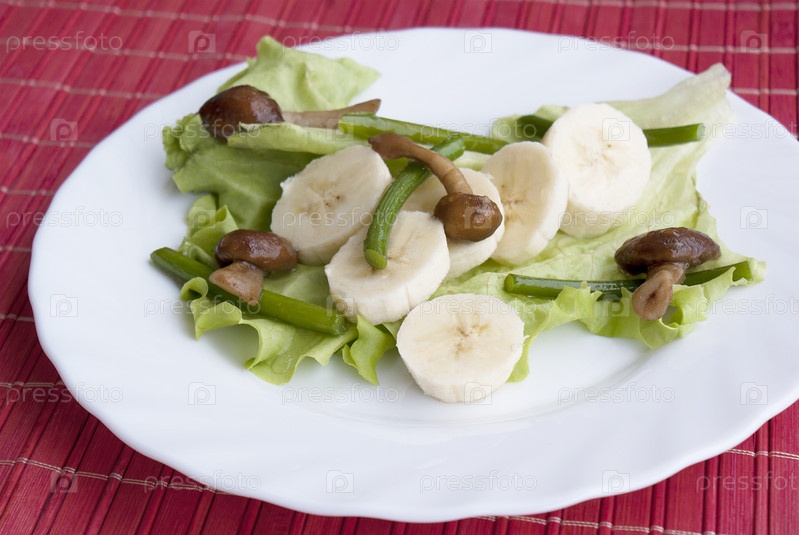 Креативный салат из жареных грибов, стеблей чеснока и сладких бананов