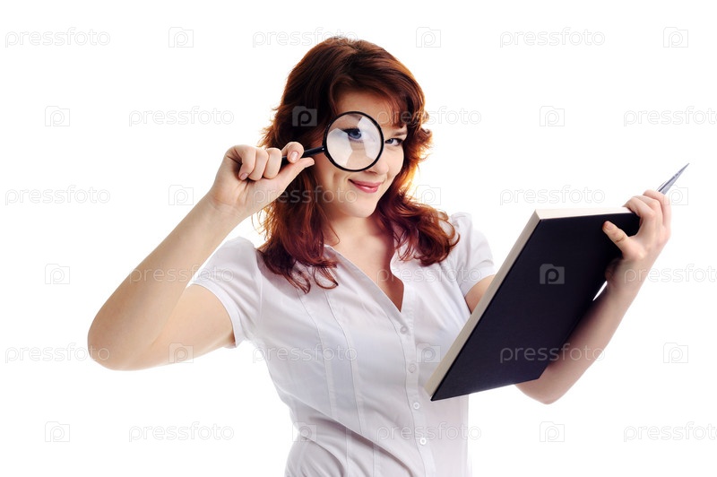 Красивая женщина с увеличительным стеклом и книгой