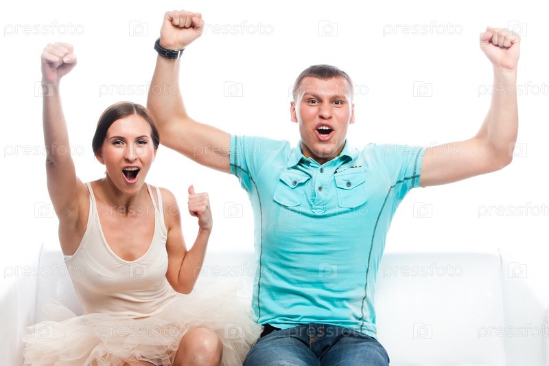 Группа спортивных болельщиков смотрит соревнования, сидя на белом диване