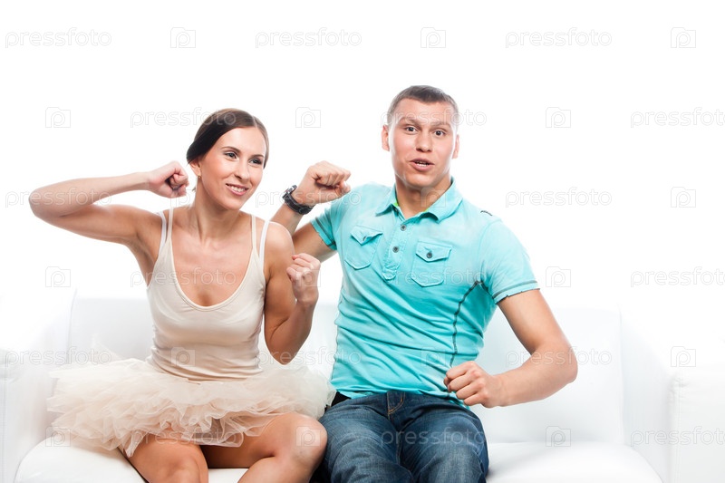 Молодая пара, сидящая на белом диване