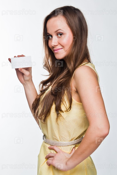 Красивая девушка с визитной карточкой в руке