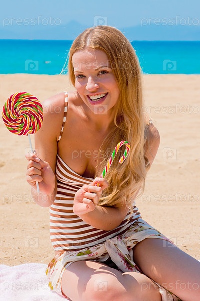 Красивая девушка с леденцом отдыхает на морском побережье