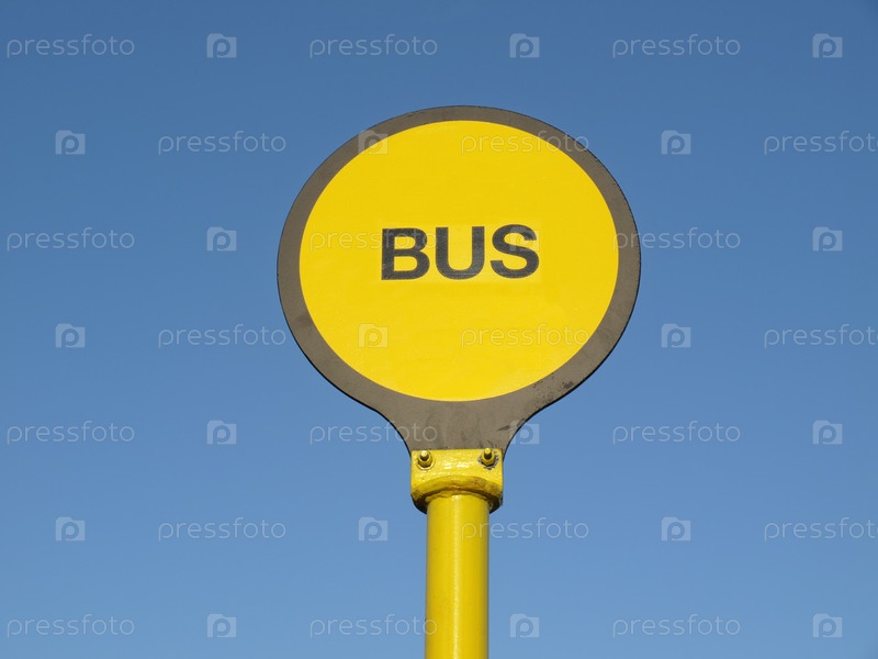 Желтый знак автобусной остановки на фоне неба