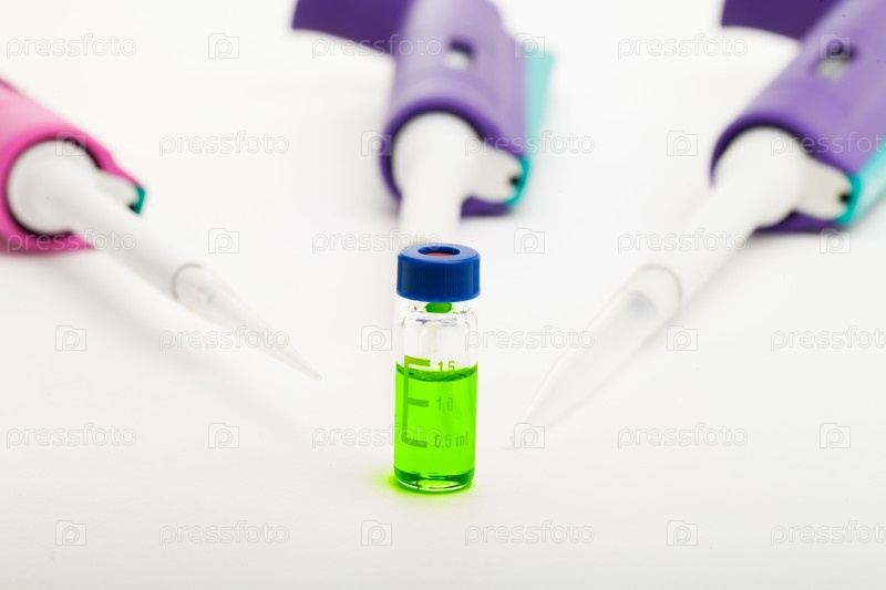 Три пипетки и хроматографическая виалка с зеленым раствором