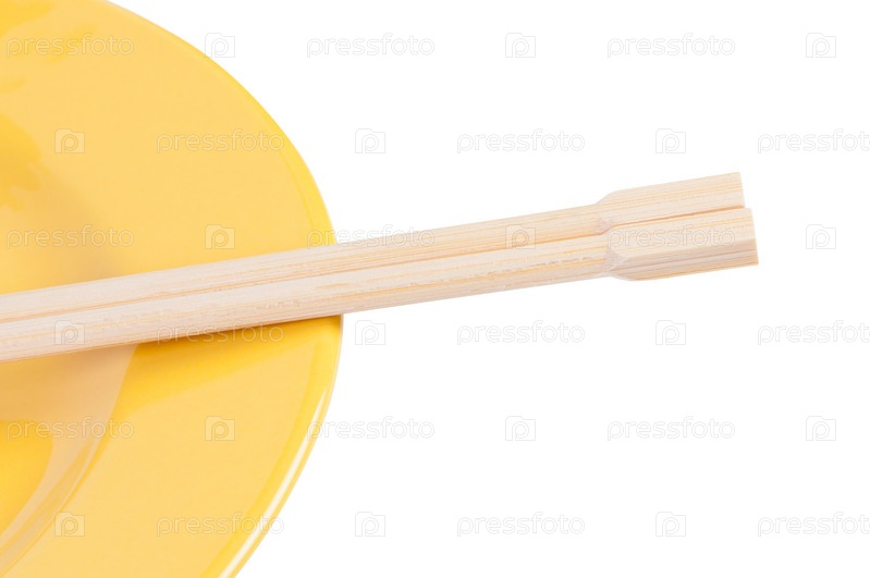 Тарелка и китайские палочки на белом фоне
