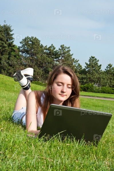 Девушка с ноутбуком лежит на траве в парке