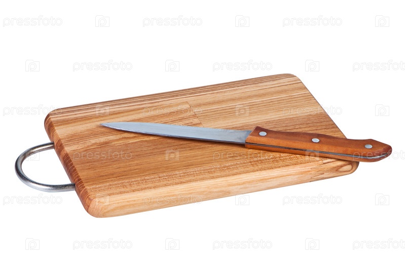 Деревянная разделочная доска с кухонным ножом на белом фоне