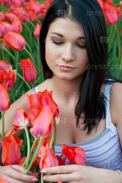 Грустная девушка с красными тюльпанами