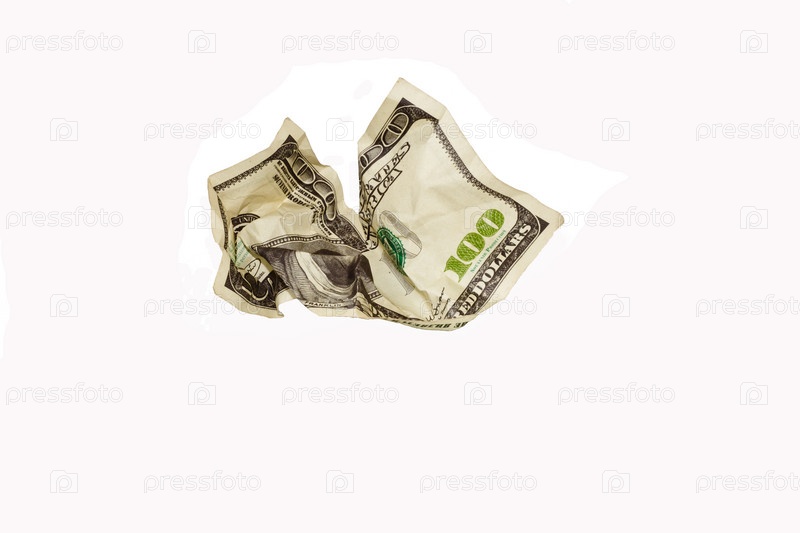 Смятая стодолларовая купюра на белом фоне