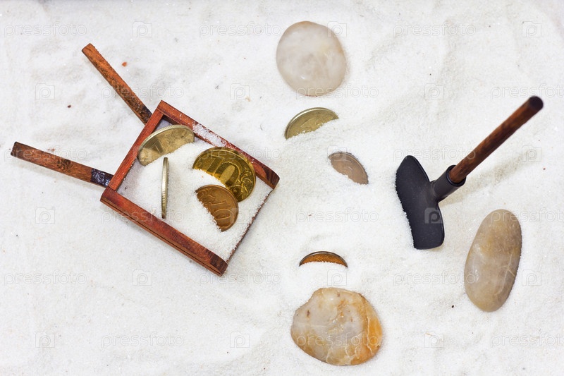 Деревянная тачка с монетами и лопата в песке
