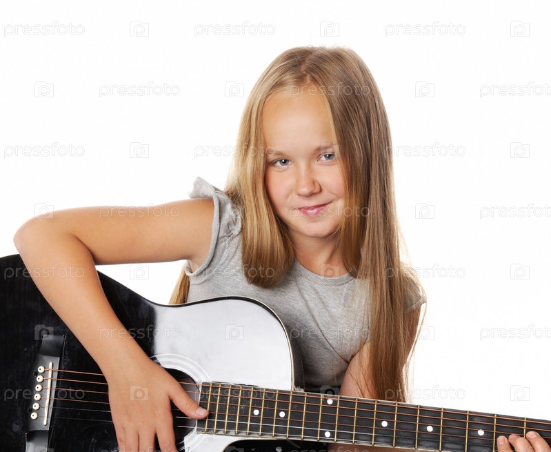 Девочка с гитарой на белом фоне