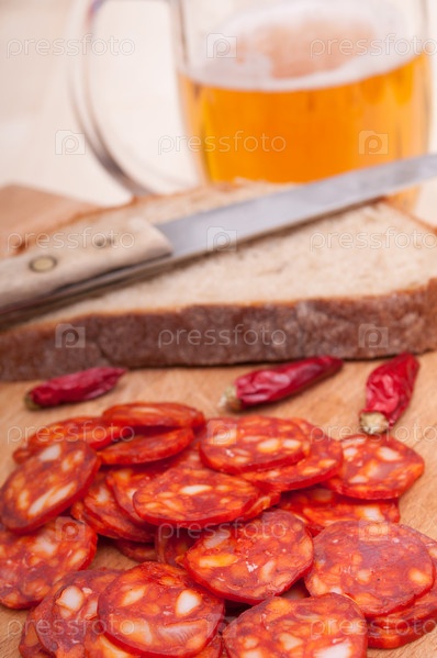 Ломтики венгерской колбасы, кусок хлеба и кружка пива