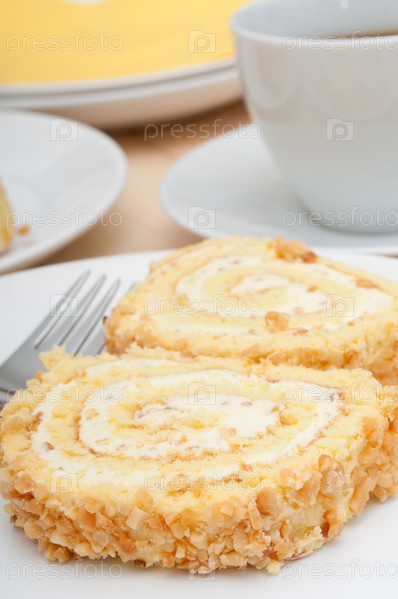 Рулет с кремом и кофе на столе