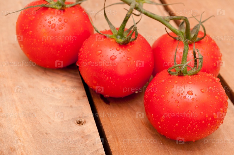 Гроздь свежих помидоров на деревянном столе