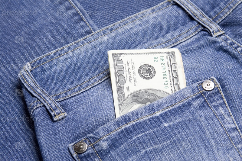Пачка долларов, выглядывающая из кармана джинсов