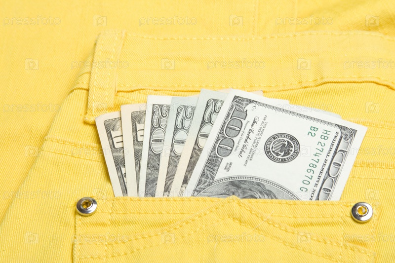 Веер из долларов, выглядывающих из кармана джинсов