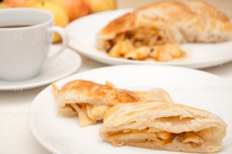 Домашний яблочный штрудель и кофе на столе