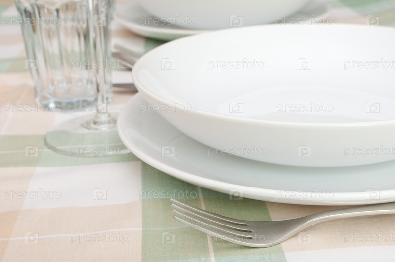 Тарелки, столовые приборы и бокалы на столе ресторана