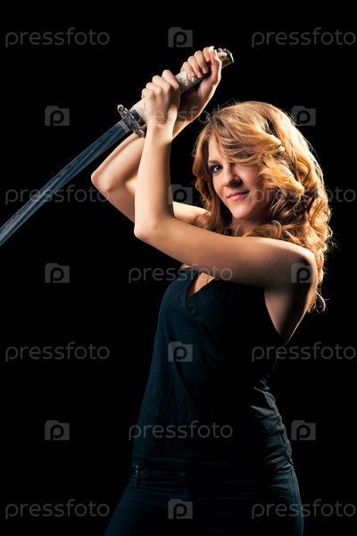 Привлекательная блондинка с самурайским мечом на черном фоне
