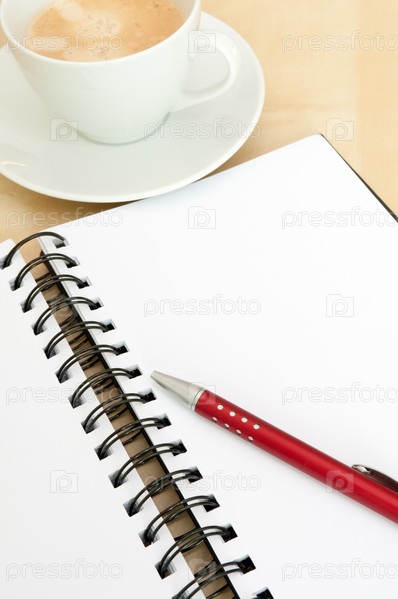 Чистый блокнот, шариковая ручка и чашка кофе на деревянном столе