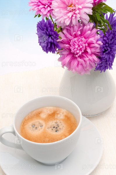 Чашка кофе и георгины в вазе на столе