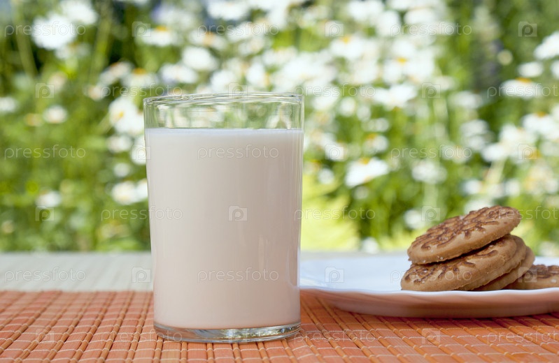 Стакан аппетитного парного молока на полдник в летнем зеленом саду