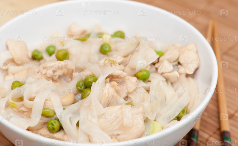 Тайская еда - куриное мясо с рисовой лапшой, горохом и орехами кешью
