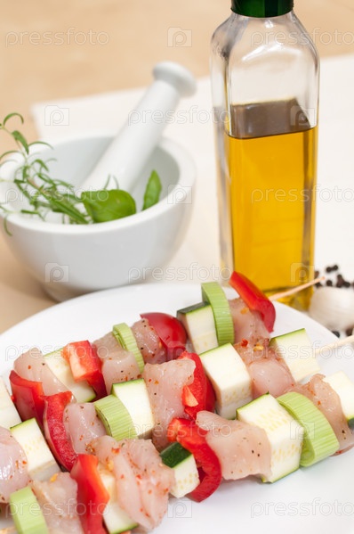Куриное мясо, перец, кабачки и лук на шампурах