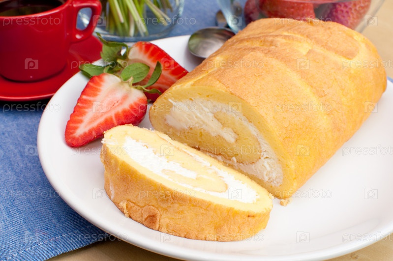 Рулет с кремом и клубникой на столе