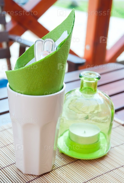 Столовые приборы и подсвечник на деревянном столе в ресторане