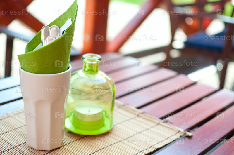 Столовые приборы и подсвечник на деревянном столе в ресторане