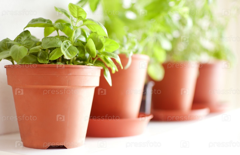 Травы в горшочках - базилик, мята и розмарин