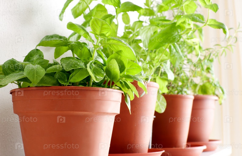 Травы в горшочках - базилик, мята и розмарин