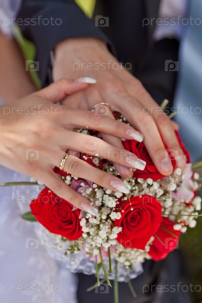 Руки с обручальными кольцами на свадебном букете