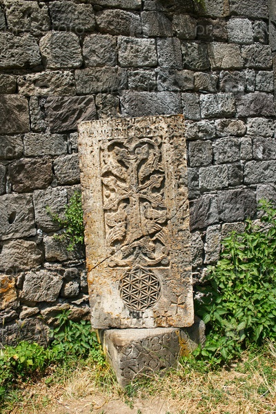 Камень с крестом или хачкар в армянском монастыре Севанаванк IX века Хачкары - высеченные мемориальные стелы, покрытые розетками и другими орнаментами, уникальное средневековое христианское искусство Армении