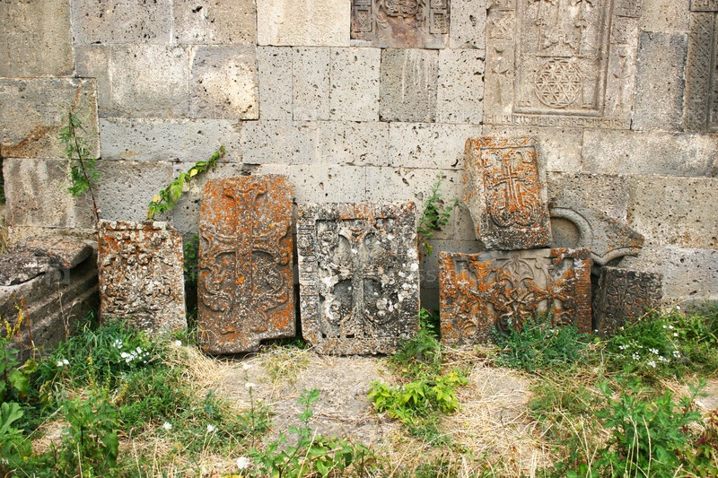 Камни с крестом или хачкар в армянском монастыре Севанаванк IX века. Хачкары - высеченные мемориальные стелы, покрытые розетками и другими орнаментами, уникальное средневековое христианское искусство Армении