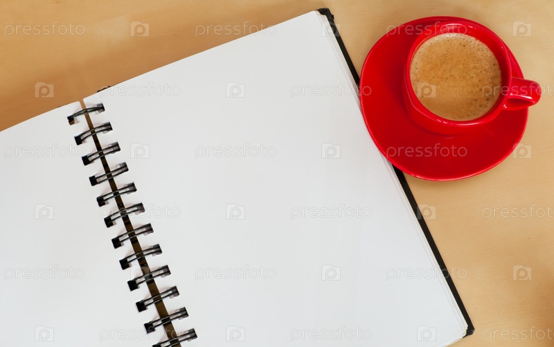 Кофе эспрессо и пустой открытый блокнот на деревянном столе