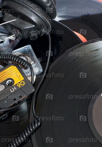 Аудиокассеты, виниловые пластинки и наушники для ретро-вечеринки