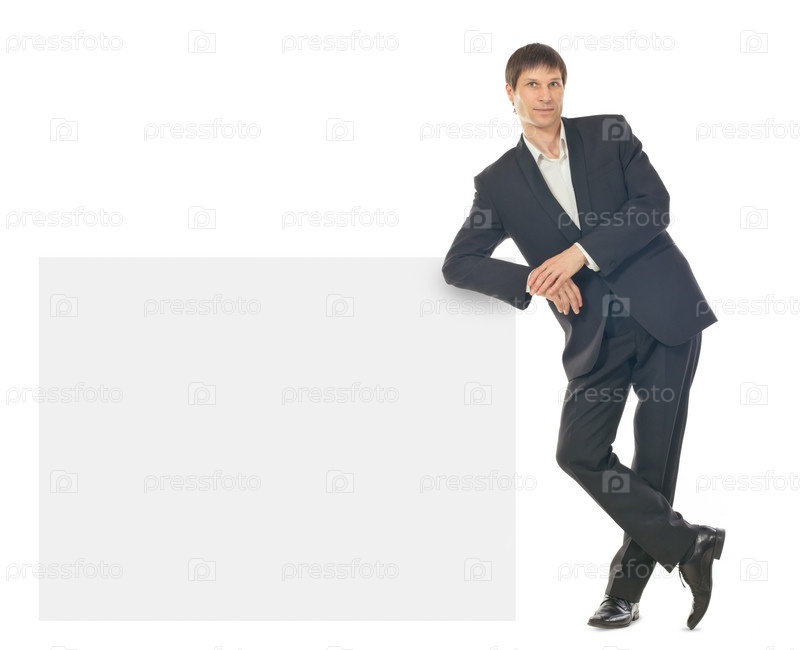 Портрет бизнесмена с пустой вывеской на белом фоне